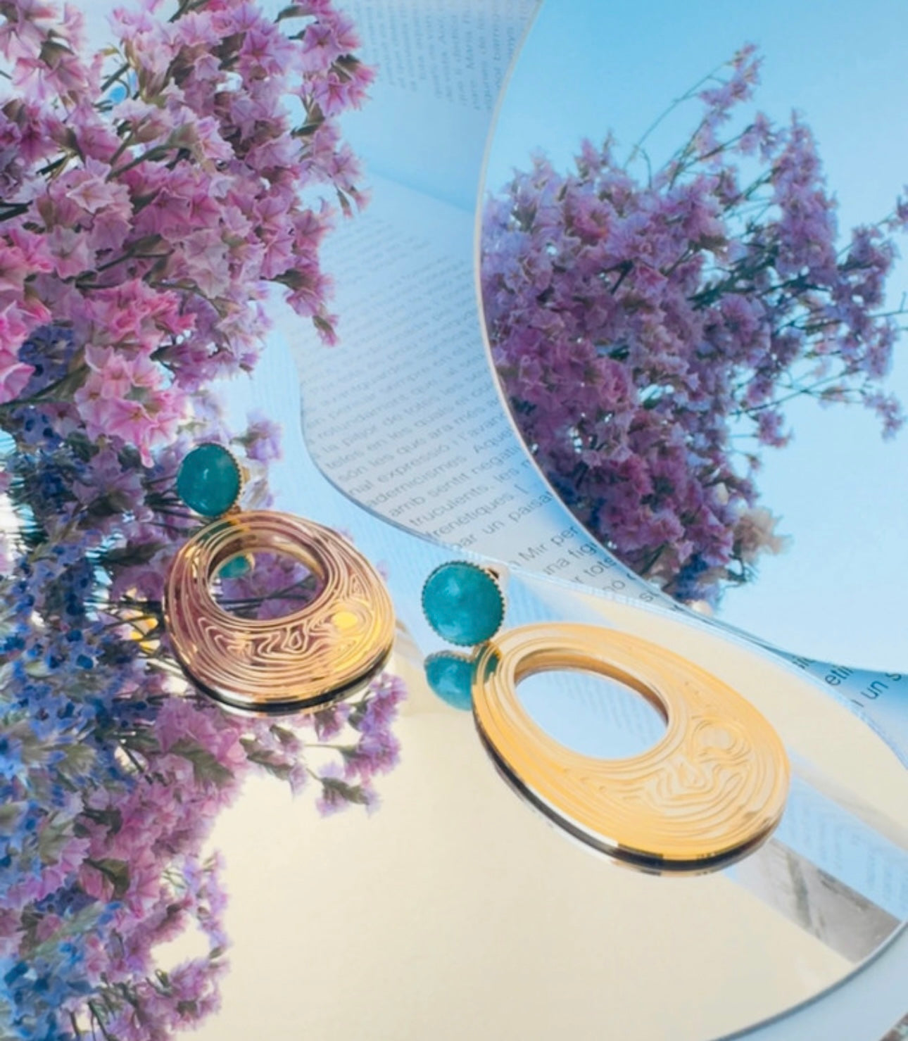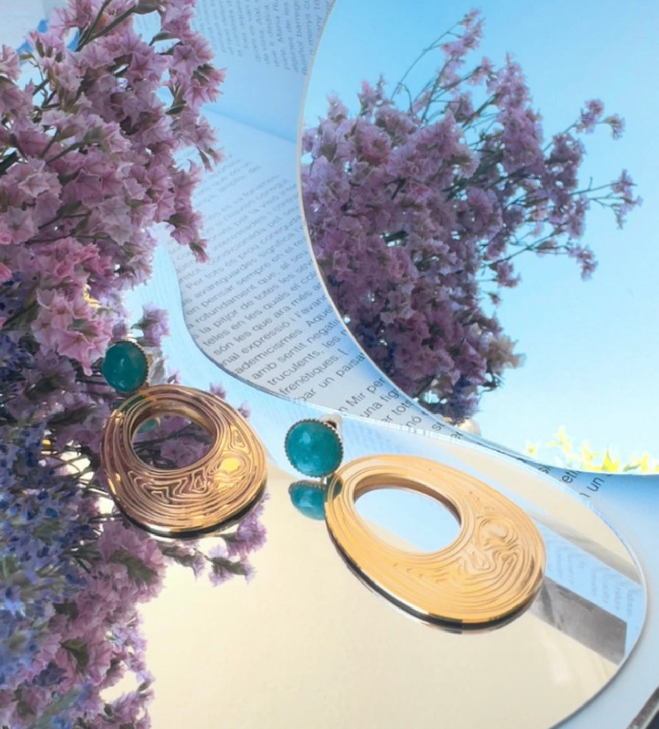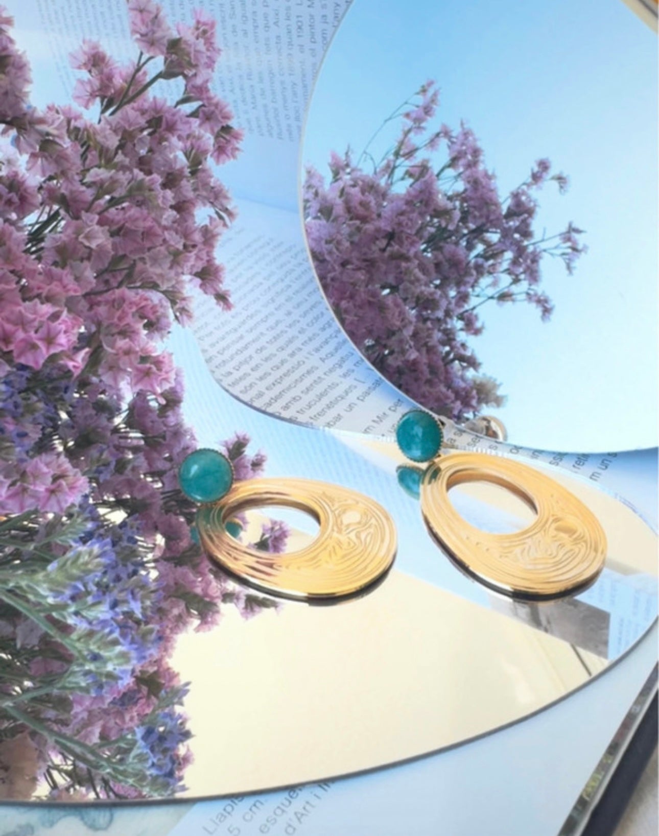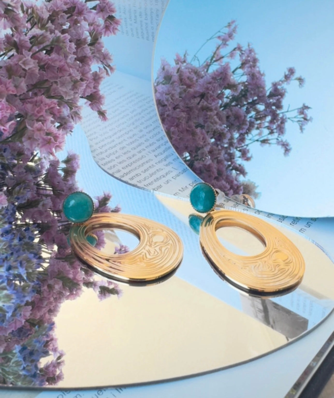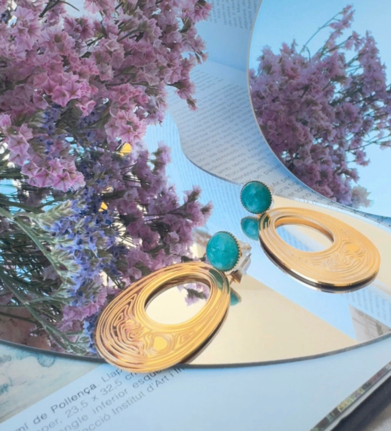 Cada pieza está delicadamente adornada con impresionantes piedras de amazonita, cuyas tonalidades vibrantes de verdes y azules evocan las aguas cristalinas que bañan la isla de Naxos, el escenario de la famosa historia. La amazonita, conocida por sus propiedades calmantes y su capacidad para inspirar la creatividad, añade una dimensión adicional a estos pendientes, convirtiéndolos en un símbolo de expresión artística y emocional.